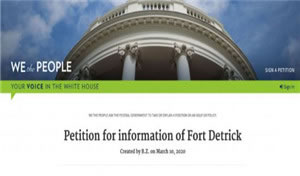 3月10日,名为B.Z.的网民在白宫请愿网站“我们人民(WE the PEOPLE)”发起一条请愿贴,要求美国政府公布去年7月关闭德特里克堡生物实验室的真正原因,以澄清该实验室是否是新冠病毒的研究单位,以及是否存在病毒泄漏问题。距离华盛顿美国陆军医疗司令部仅一小时车程的德特里克堡,究竟在进行什么实验,是否造成大规模泄露?美国疾控中心(CDC)检查德特里克堡时都发现了什么?