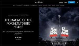 本文译自2019年3月4日《纽约客》(The New Yorker)发表的专栏作者简·迈耶(Jane Mayer)撰写的长篇深度调查报告《福克斯新闻白宫的诞生》。该报道披露了美国收视率最高的有线电视台福克斯新闻与特朗普白宫的利益关系,包括福克斯如何通过煽动民粹情绪提升收视率并打造、强化特朗普的执政基本盘,以及特朗普如何利用行政权力压制福克斯的竞争对手、回馈以商业利益。